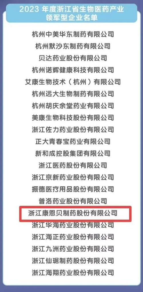 全力构建大中小企业融通发展的产业生态,加快推动生物医药与医疗器械产业集体培育建设,浙江省经信厅组织开展生物医药产业重点企业培育提升工作,日前发布了2023年度生物医药产业 21 家领军型企业和 26 家高成长型企业名单。康恩贝荣登“2023年度浙江省生物医药产业领军型企业名单”。