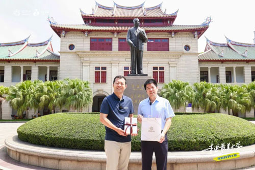 王总与许院长在厦门大学创办人陈嘉庚像前互赠礼物