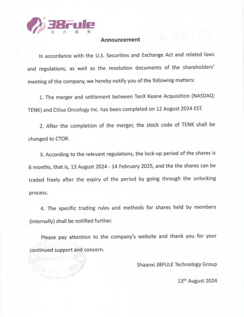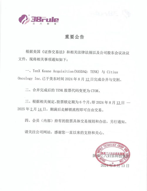 一、TenX Keane Acquisition(NASDAQ:TENK)与Citius Oncology Inc.已于美东时间2024年8月12日完成合并与交割。