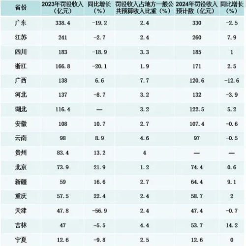 此外,其他省市的罚没收入虽然暂未有官方数据,但记者注意到,第一财经曾经根据各省份财政部门披露的2023年预算执行情况和2024年预算草案等整理出一份《16省份2023年罚没收入情况和2024年收入预期》,仅供参考。