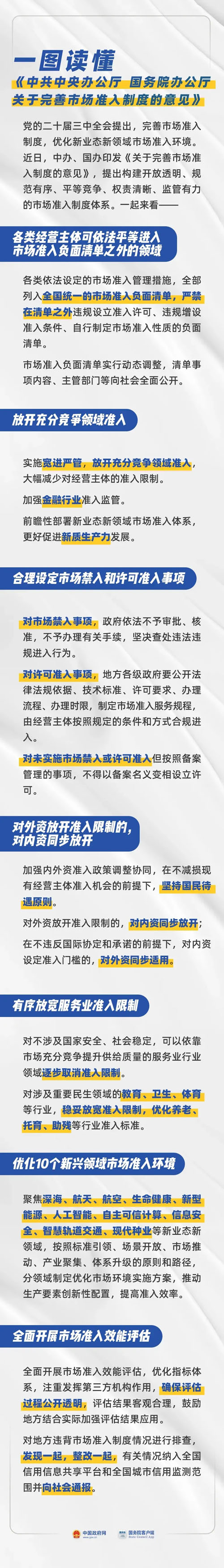 市场准入制度是社会主义市场经济基础制度之一,是推动有效市场和有为政府更好结合的关键。为深入贯彻党的二十届三中全会精神,完善市场准入制度,深入破除市场准入壁垒,构建开放透明、规范有序、平等竞争、权责清晰、监管有力的市场准入制度体系,经党中央、国务院同意,现提出如下意见。
