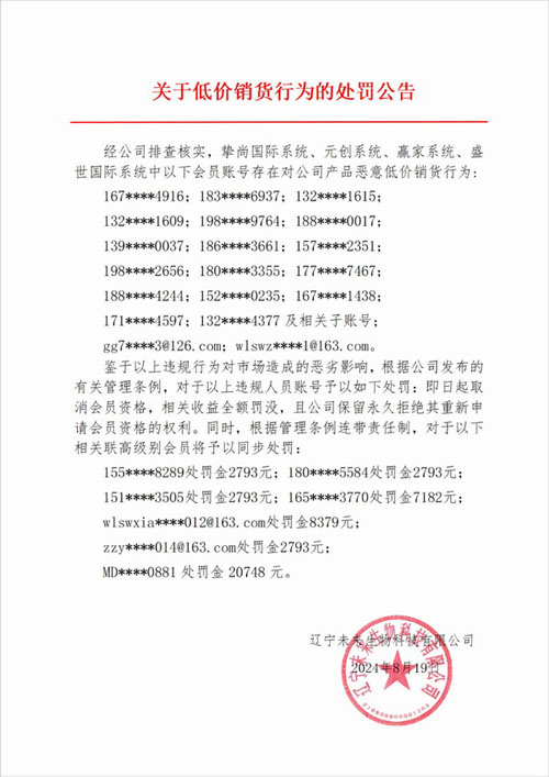 鉴于违规行为对市场造成的恶劣影响,辽宁未来生物科技有限公司将根据公司发布的有关管理条例,持续对违规行为进行排查核实,并对存在违规行为的人员进行相应处罚,处罚公告如下:
