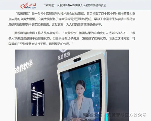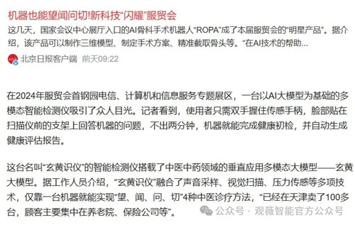众多媒体的报道与宣传,进一步提升了“玄黄识仪”及观薇智能的品牌影响力。人民网记者黄盛在展会现场体验了“玄黄识仪”后,对其便捷性与高效性给予了高度评价,并详细报道了观薇智能在AI与大健康领域融合方面的探索与成就。光明网、中国网等媒体也纷纷聚焦观薇智能,从不同角度展现了公司在服贸会上的精彩表现与深远影响。