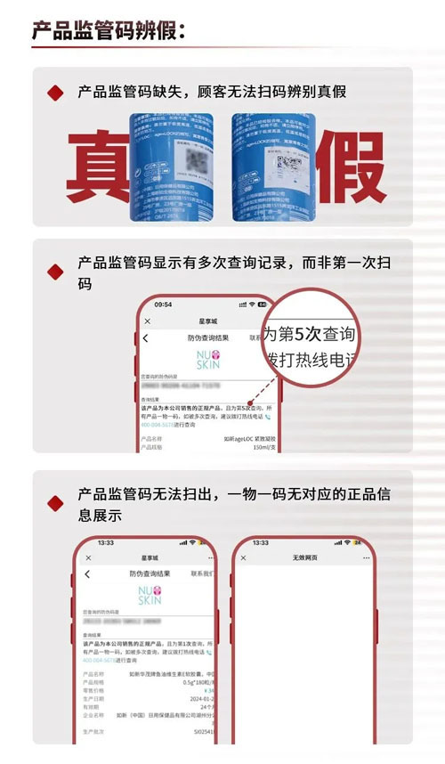 同时,为减少市场上假(仿)货、低价货的流通,如新还采用了产品防伪、包装防伪技术、“一物一码”制度等措施。据介绍,如新的所有产品包装上均印有由中国产品质量电子监管网所颁发的中国产品质量电子监管码,消费者可通过该码查询真伪,复核产品相关信息。目前如新已建立了完善的产品追溯机制,对产品进行全程监管。如果产品监管码显示有多次查询记录,而非首次扫码,极可能为假货。