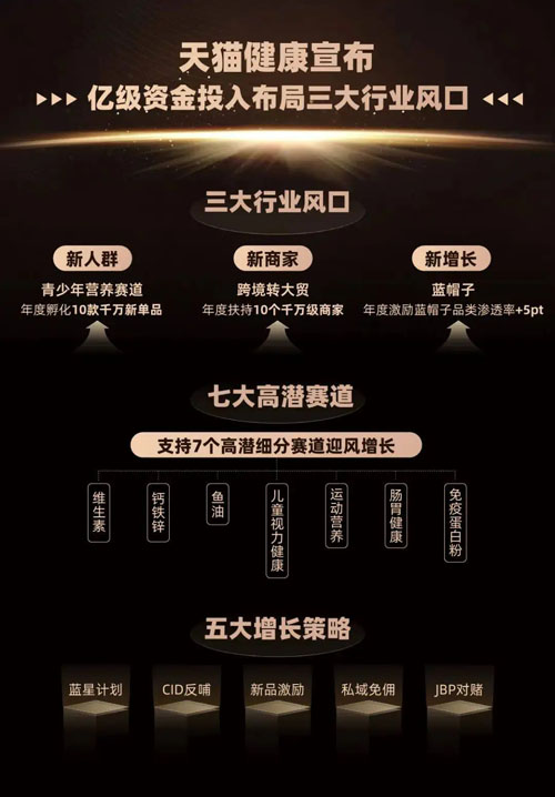 为更好构建健康生态,帮助商家获得确定性增长,2025年,天猫健康将投入亿级资金,聚焦“新人群、新商家、新增长”布局三大行业风口:青少年营养赛道——计划年度孵化10款千万级新单品、30款百万级新单品;跨境品牌转大贸——给予全周期服务,精准发力潜力赛道,快速打开市场,年度扶持10个千万级商家;蓝帽子保健食品——年度激励蓝帽子品类渗透率增长5%。
