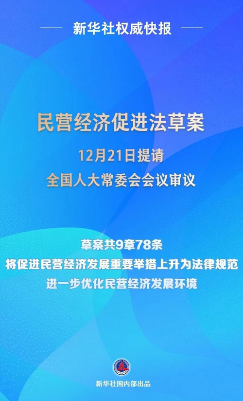 备受关注的民营经济促进法立法,迎来新的进展。12月21日,民营经济促进法草案提请十四届全国人大常委会第十三次会议审议。