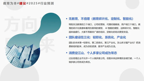 第七,无教育,不倍增(教育碎片化、定制化、智能化)。特别关注教育的三个端口,公司经营端、代理经销商端、用户端三个端口。教育的碎片化就意味着用互联网的模型、AI智能的模型,这种碎片化、智能化越来越盛行。大家不再喜欢广谱的培训,定制化的培训更受欢迎。