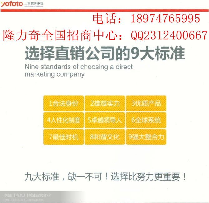 隆力奇全国招商热线:QQ:2312400667 电话:18974765995全天在线咨询!隆力奇公司具有25年历史,已经拿到国家商务部颁发的直销牌照,没有问题!公司的产品,根据经验,只要是正规直销公司的产品,只要是它敢于用直销的方式销售,产品一般都不会差,因为直销,都是自己用的感觉好才会介绍给自己的亲朋好友。当然,非法的短命的传销公司的产品除外。而隆力奇公司的产品都是经过二十多年市场验证的。