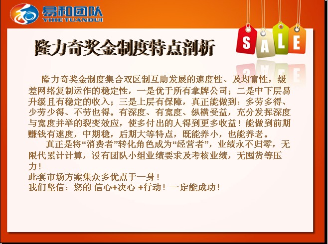 机会是抓来的,不是等来的。等待只有延缓成功,延误战机,推迟享受。不管您什么时候选择加入,也都是从零做起,都是组建自己的消费团队。目前隆力奇直销全国市场一片空白,正是跑马圈地,抢占地盘的黄金时机。今天的隆力奇是一艘大船、快船,登上这艘船一定能安全平稳的到达目的地。在公司开业前后努力工作半年一年时间相当于开业后 2 到 3 年的付出,这就是机会,很多人想要,但苦于得不到信息。今天您准备好了吗?