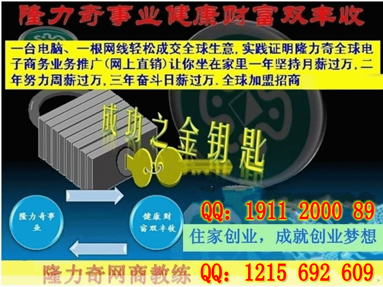 隆力奇 定制营销是一个可以改变你个人及家族命运的事业机会 如今电脑已走进千家万户,网络时代已经来临,网上创业已成为势不可挡的时代趋势,让我们凭借智慧和眼光,把握先机,引领潮流,成就未来!隆力奇陈三星 QQ:1215692609 QQ :1911200089 热线:15909502218