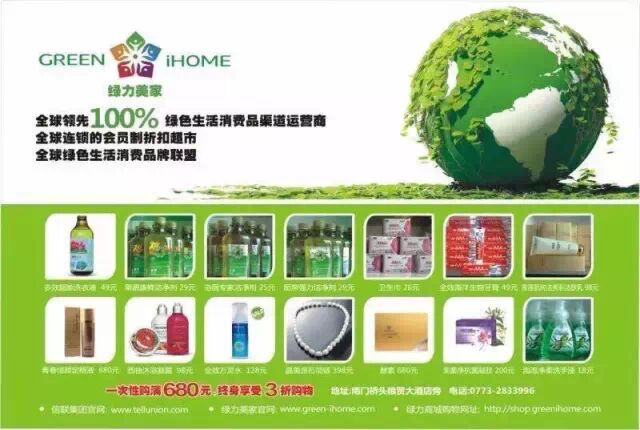 商品的促销:绿力美家,多购多惠,同时结合免费电话业务,积分换购等促销的方式 ,折扣最低低至3折, 让会员抵挡不住购物的欲望从而大量的重复消费。