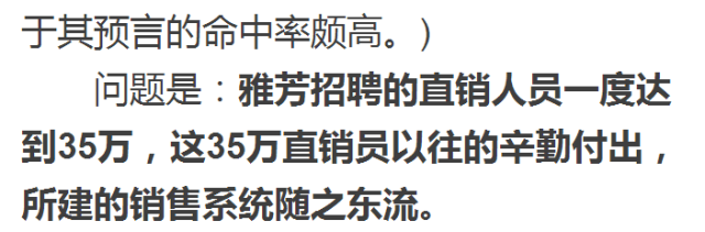 雅芳退出中国的事件发生,我们同样要喊一些口号,以此来提醒、告戒“难民”、“乞丐”们:坚持,并不一定是正确的;方向不对,努力白费;选择大于努力;我们可以坚持梦想,决不能坚守阵地。方法正确,事半功倍;条条大路通罗马,最最关键是方法!这是错误地延用、借取了发达国家的直销理念的结果。