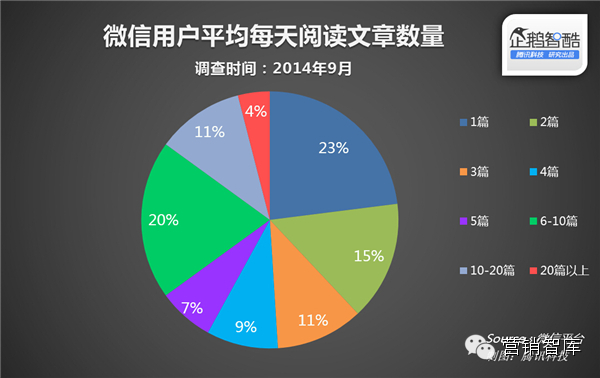 5.86篇是一个平均数,不同的用户每天阅读的文章数存在挺大差异。从图表中可看出,23%的用户平均每天只阅读1篇文章,但也有20%的用户每天阅读6篇到10篇。