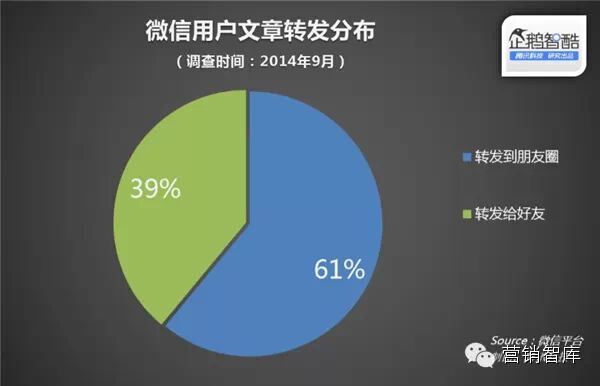 微信用户看到了想要转发的文章,61%转发到了朋友圈,39%的文章转发给好友。有目标性地分享可以看成是微信用户分享文章的特点,虽然转发到朋友圈可以让更多朋友看到,但依旧有接近40%的内容转发给好友。