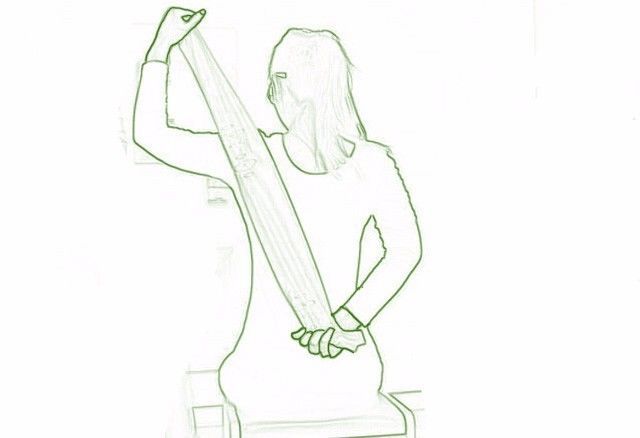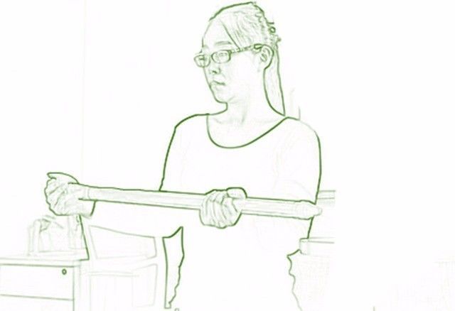 招式1: 上臂与胸廓贴紧,双手持一根木棍,用健康的手掌通过木棍推患病一侧的手掌,使患病一侧的手带动前臂外展。(达到极限后,坚持6秒,注意做这个动作时上臂要贴近胸廓)