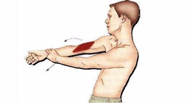 自我治疗:患病的上肢上抬,肘关节伸直。手腕下垂到最大限度,然后腕关节内旋,用健康的手施加压力保持这个动作坚持10秒,这样就完成了一次牵拉训练。5次算一组,一天3组。坚持一段时间,效果会非常明显。