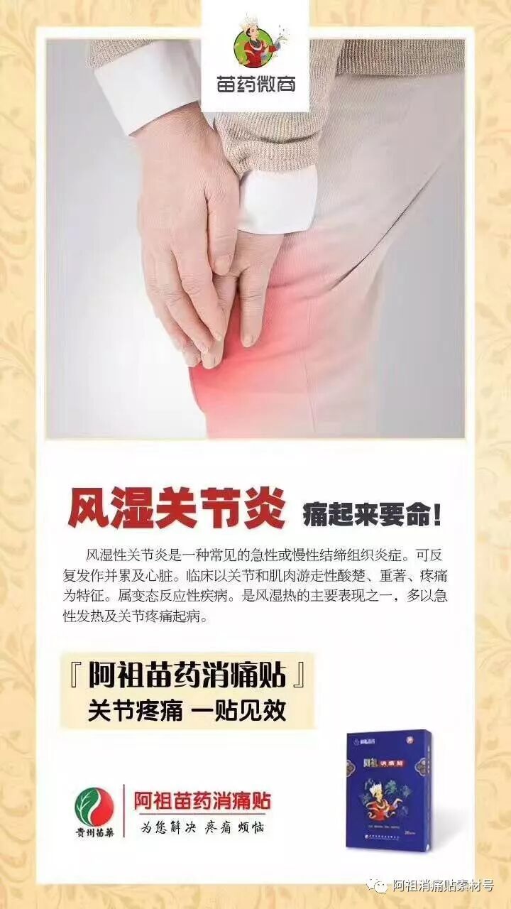 «上一篇:阿祖消痛贴:类风湿关节炎---这10个症状不能忽视! 下一篇:苗药阿祖消痛贴:骨性关节炎、类风湿关节炎、痛风性关节炎……关节炎有这么多,你知道吗?»