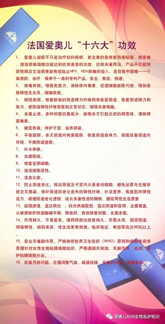 1、爱奥儿凝胶不只是治疗妇科疾病,更主要的是修复阴道粘膜,排宫毒,激活卵巢细胞功能达到抗衰美容的功效,达到夫妻同治,产品不仅能预防性病及艾滋病更能有效阻止HPV、HSV病毒的侵入,是目前中国唯一一个集预防、治疗、保养于一身的专利产品。安全,有效,快速。