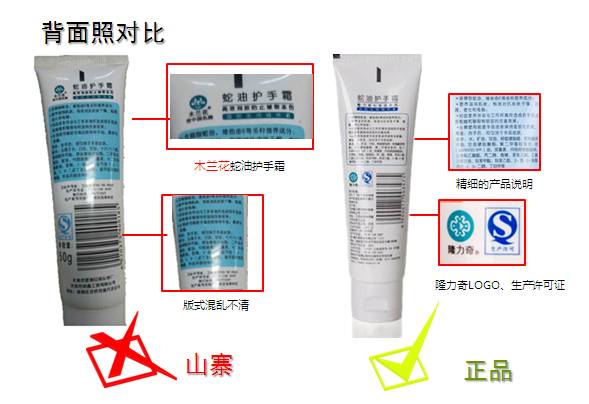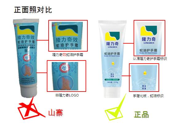 近日,收到了两张来自忠实隆粉发来的 “隆力奇”蛇油护手霜照片。乍看还以为是自家的护手霜,仔细一看,却发现这玩意儿,事实上是“隆力奇效”护手霜,其外型酷似隆力奇蛇油护手霜,相似程度竟达到了90%。