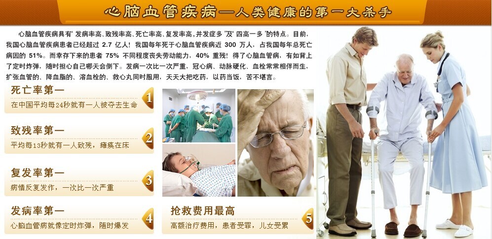 心脑血管疾病是一种致残率高的疾病。一旦得上这类疾病,自己很难生活自理,给家庭造成很大的经济负担和心理压力。病人自己也常常因为拖累了家人,心情不畅,反而影响了疾病的治疗。心脑血管疾病具有“发病率高、致残率高、死亡率高、复发率高,并发症多”即“四高一多”的特点,目前,我国心脑血管疾病患者已经超过2.7亿人!我国每年死于心脑血管疾病近300万人,占我国每年总死亡病因的51%。