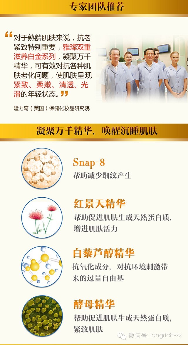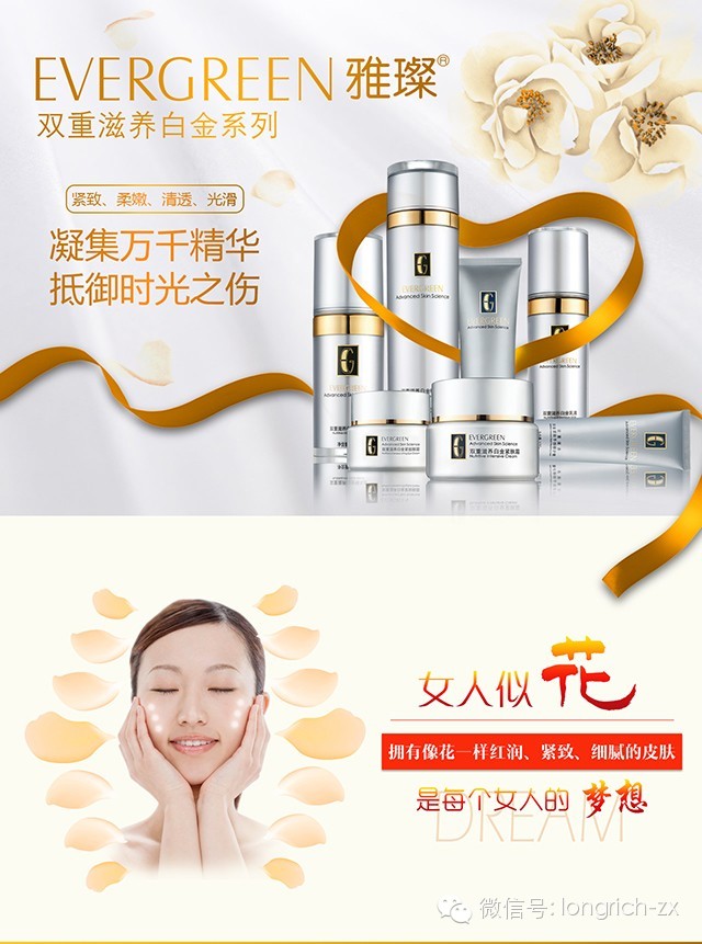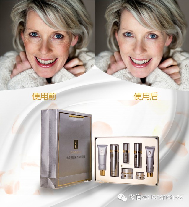 上图为隆力奇公司海外经销商使用双重滋养白金系列产品后的效果:肌肤明显滋润了,没有紧绷的感觉,肤色提亮了很多,保湿效果也非常不错,尤其使用了双重滋养白金精华露之后,效果更好。爱美的姐妹们,让我们跟着雅璨一起变得年轻自信起来!