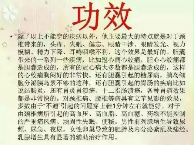 隆力奇艾力沛增力鞋对颈椎病、腰椎等病具有立竿见影的效果。对于由颈椎病所引起的高血压、高血脂、高血糖、药物不能控制的严重痛风病、顽固性失眠、便秘、男性前列腺增生导致尿频、尿急、夜尿,女性卵巢导致的肥胖及内分泌紊乱及痛经、乳腺增生具有显著的辅助治疗作用。