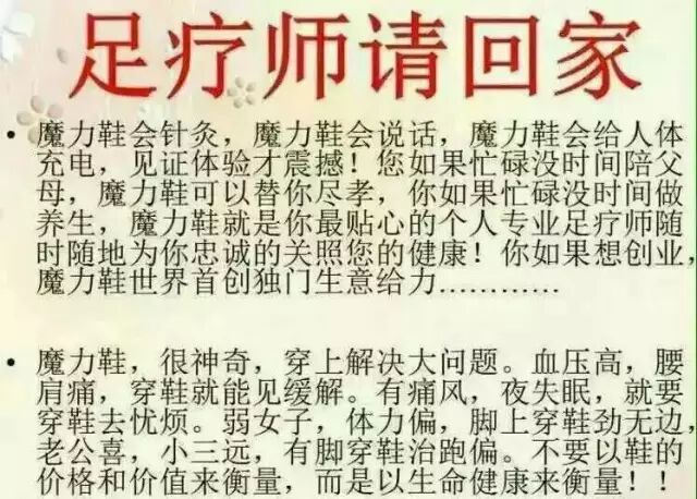 能量鞋会针灸,能量鞋会说话,能量鞋会给人体充电,见证体验才震撼!您如果忙碌没时间陪父母,魔力鞋可以替你尽孝,你如果忙碌没时间做养生,能量鞋就是你最贴心的个人专业足疗师随时随地为你忠诚的关照您的健康!你如果想创业,能量鞋世界首创独门生意给力……