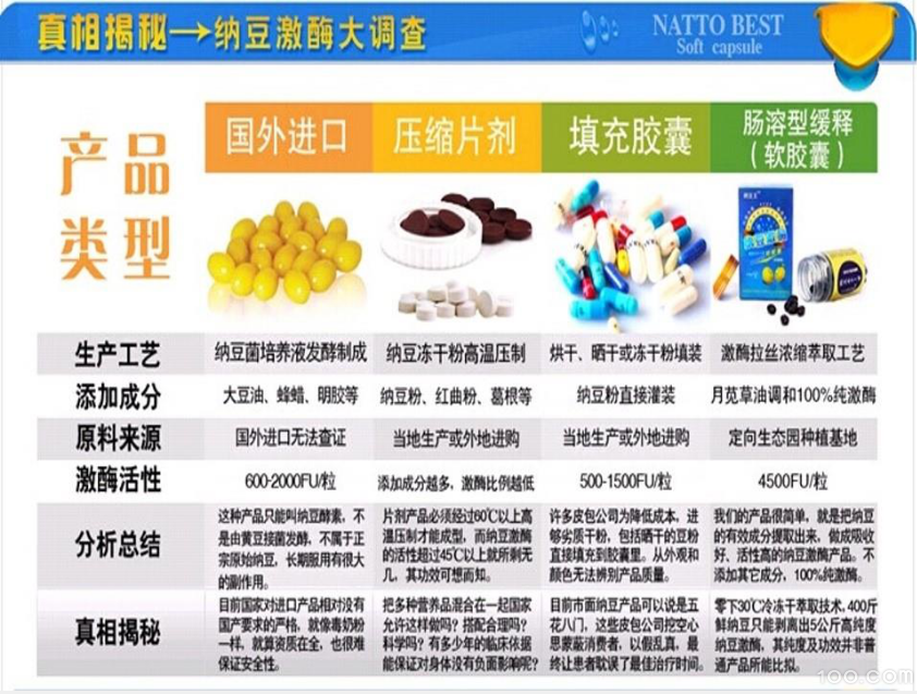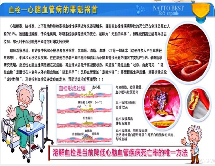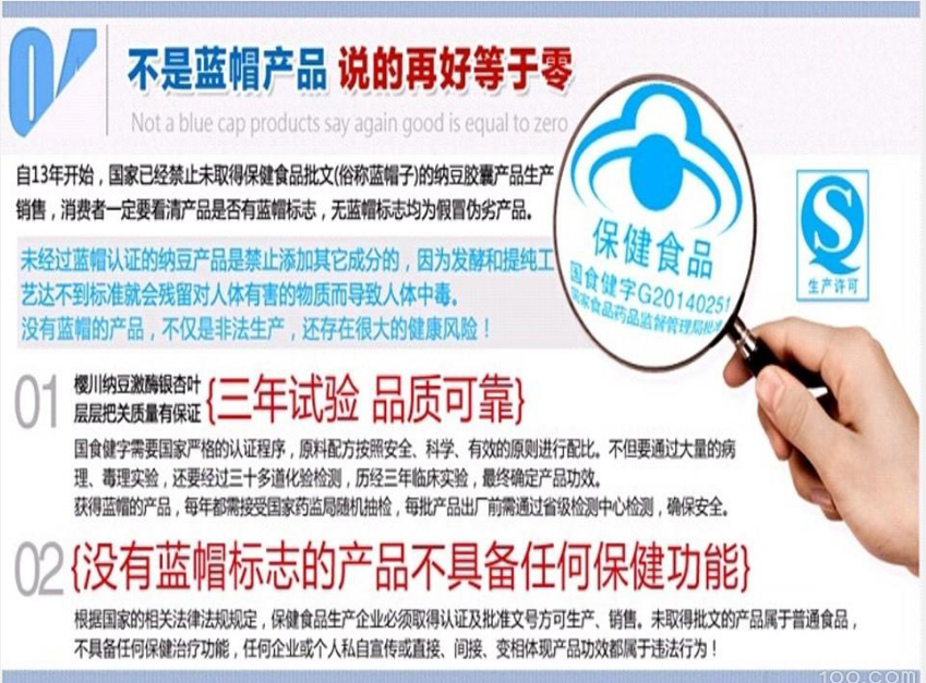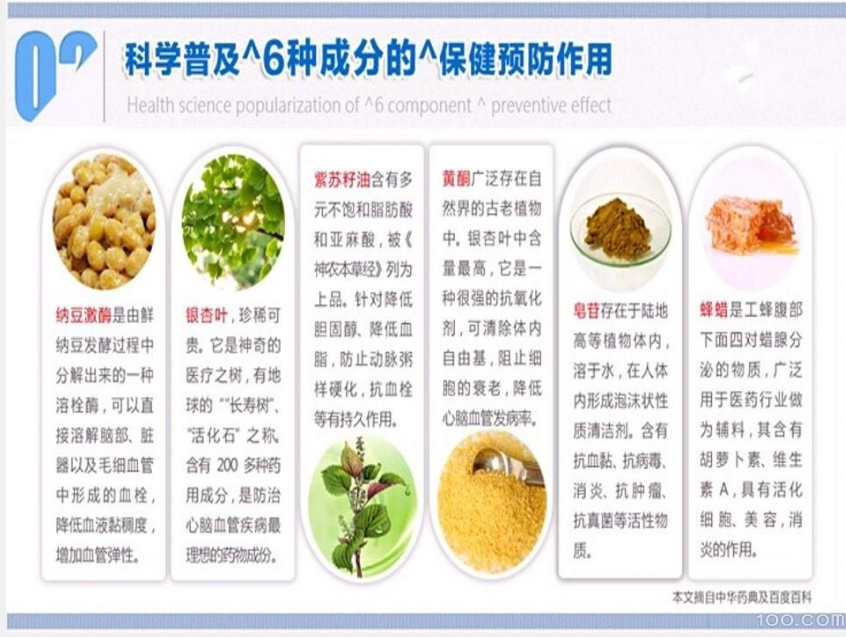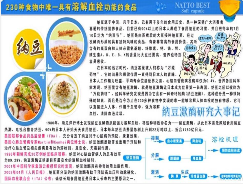 “血管清道夫”之王---心脑血管疾病患者的福音:纳豆紫苏籽油软胶囊,100%原生态纯天然植物精华萃取,高活性、高科技、高品质,世界领先的黄金配方——纳豆激酶+银杏叶+紫苏油,三效合一,一步到位,国家药监局正式批准蓝帽产品。60倍溶解血栓、有效降低血压、清除多余血脂、消除动脉硬化! 【产品名称】樱川牌纳豆银杏叶紫苏籽油软胶囊。 【产品说明】本品是以纳豆冻干粉、银杏叶提取物、紫苏籽油、蜂蜡、明胶、甘油、纯净水为主要原料制成的保健食品,经动物和人体试验证明,具有辅助降血脂的保健功能。100%原生态纯天然植物精华萃取,高活性、高科技、高品质,世界领先的黄金配方——纳豆激酶+银杏叶+紫苏油,三效合一,一步到位,国家药监局正式批准蓝帽产品。60倍溶解血栓、有效降低血压、清除多余血脂、消除动脉硬化! 【保健功效】辅助降血脂。改善心脏血流、保护缺血心肌的功能,降低胆固醇、甘油三酯,升高高密度脂蛋白,改善血液流变学的某些指标,明显改善冠心病患者的临床症状,如对头晕、胸闷、心悸、气短和乏力均有较好的改善作用。 【功效成分】每100g含:总黄酮0.54g、总皂苷110mg 。 【主要原料】纳豆冻干粉、银杏叶提取物、紫苏籽油、蜂蜡、明胶、甘油、纯化水。 【适宜人群】血脂偏高者。 【不适宜人群】少年儿童、孕妇、乳母。 【批准文号】国食健字G20140251。 【食用方法及食用量】每日2次,每次3粒,口服。 【规格】0.5g/粒*90粒/瓶*6瓶/盒。 【保质期】24个月。 【贮藏方法】密封,置阴凉干燥处。 【注意事项】本品不能代替药物。 【主要作用】 1、溶解血栓、调节血脂、血压及预防粥状动脉硬化。 2、调节血糖、调节肠胃润肠通便排毒养颜。 3、抗菌、抗氧化、抗癌作用、防止骨疏松。 4、解酒、保护肝脏、缓型减肥不反弹。 5、明显改善女性更年期综合症。 6、预防飞蚊症。 7、纳豆中富含纳豆菌和优质缮食纤维,可以抑制肠内病原菌生长,清理肠道,防止便秘,改善消化系统;还具有除皱、抑制雀斑的美容功效。 8、纳豆中起码有5种抗癌物质,特别是异黄酮,它能有效预防、治疗乳腺癌。 9、纳豆中富含的优质蛋白和卵磷脂极易被人体吸收,有效补充人体所需营养。 10、纳豆含有人体所必需的22种微量元素、18种氨基酸、10种矿物质,对预防醉酒及小儿挑食厌食,对高血压、高血糖等多种病症都用一定的食疗保健作用。 【特点】60倍溶解血栓、有效降低血压、清除多余血脂、消除动脉硬化: 1、快速溶解血栓,疏通血管——避免心梗、脑中风等。 2、清楚血管壁沉淀杂质,洁净血液——修复受损血管。 3、有效降低血压,改善血液微循环——预防动脉栓塞猝发。 4、降低血液粘度,降低胆固醇——预防动脉粥样硬化。 适宜人群 适用于心脑血管障碍及高血脂,高粘血症,高血压,动脉硬化,冠心病,脑血栓,心脑供血不足,中风后遗症等人群服用。 1、血栓隐患及血栓性疾病人群; 2、心脑血管疾病(高血脂、高血压、高血粘、高血糖、冠心病、动脉硬化、中风后遗症)人群; 3、免疫力低下者; 4、肠胃功能失调人群,经常便秘者; 5、中老年骨质疏松人群、肿瘤人群; 6.、经常应酬者; 7、所有成人,尤其 35岁以上者; 8、有家族遗传史(如高血压、糖尿病、冠心病等)有不良生活行为者,如吸烟酗酒、缺乏运动; 9、有代谢综合征倾向,如肥胖、高血压、高血脂、高血糖、高血粘引发的动脉硬化、心脏病、冠心病、心肌梗死、脑血栓及后遗症患者。 尤其是以下人群更应当引起高度重视,需要立刻预防心脑血管疾病。 (1)机关干部、企事业领导、知识分子等。 由于他们每天压力过大,精神紧张,导致人体神经失调,新陈代谢发生紊乱;主要器官功能失去平衡,易造成动脉硬化,从而引起冠心病和脑血栓。 (2)烟酒过度、生活无规律者。他们较易造成血管痉挛,血流不畅,往往过早患心脑血管疾病。 (3)肥胖及饮食不科学者。他们往往营养过剩,使血液中的胆固醇含量过高。 (4)40岁以上者,尤其是有头晕目眩、心慌气短、记忆力衰退、四肢麻木、听力和视力下降等症状的中老年朋友。 注意事项 孕妇不推荐食用,手术前后2周暂停食用,以免影响伤口愈合。 其它与血液凝集相关疾病,须先请教医生后方可食用。 若有大量出血,如血管破裂、意外事故等也应避免食用。 如脑溢血患者须在症状发作期后3个月才适合食用。 纳豆激酶胶囊属于功能性食品不能替代药物。 不受胃酸干扰,直达小肠吸收,体内作用时间8-12小时。 低热量,低蛋白,肥胖及肾病患者可安心食用。 与药物同食无抵触且可降低药物的不良反应。 不含嘌呤与维生素K2,痛风及服用华法令患者也可安心食用。 服用后的效果,立竿见影: 第一阶段:服用7天,血液活起来:胸闷心慌、头晕眼花、失眠、手脚发麻僵硬等症状逐渐消失,血压、血脂开始降低。 第二阶段:服用1个月,血栓逐渐溶解,血液循环通畅,避免了二次中风的危险;血压、血脂接近正常值、并且稳定;重病患者麻木的肢体,开始稍有知觉。 第三阶段:服用3个月,血流动起来:血管更加富有弹性,管腔逐渐增大,血液供应更加充分;脑部神经得到了有效滋润,侧枝循环更加密集发达;重病患者语言功能开始恢复,原来口齿不清的人,说话能成句了,眼睛有神,感觉肢体有力。 第四阶段:坚持服用,血管通起来:全身的血液得到了一次彻底的清洗,血栓、多
