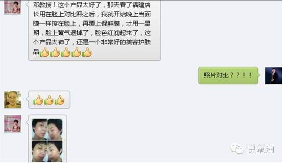 用臭氧1、每天晚上把脸洗干净、然后把臭氧1擦在脸上每天当面膜、从店长培训那天拍照时听董事长分享后我一直在用。脚气已经困扰我多年了,很严重、第一次用臭氧1擦在脚上痒得我一晚也没有睡好、第二天再擦上就没有那么痒了、这周我去了足疗房、技师看了我的脚很惊讶、怎么脚气好的这么快、我跟他推荐了我们的臭氧油1、技师一下买了十盒。臭氧油太神奇了!感谢董事长给了我们这么好的平台又研发了这么好的产品!太感谢了!