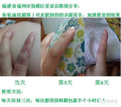 一天早上从锅里面往外端蒸菜时,不小心被不锈钢菜盆烫伤了左手的食指和中指的第一节,当时用自来水冲洗了一下,5分钟后才想起用臭氧油抗菌剂Ⅰ涂抹,当天晚上又涂抹了一次,被烫伤的部位发红,有点痛;第2天早上涂抹一次,中午发现被烫伤的部位发白了,可能要起泡,老经验想,那个部位的死皮会慢慢脱离的,可是,第三天上午9点左右,突然发现,那两个发白的部位居然完全恢复了,真正体验了一把臭氧油抗菌剂“活化细胞”的功效!不得不惊叹臭氧油抗菌剂的“神奇”!