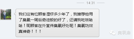 5月18号上午和家医在线邓老师聊起自己的烦恼:鼻翼两侧皮炎红肿骚痒,22号还要参加演讲比赛,很影响形象,建议外涂臭氧油抗菌剂Ⅰ号、当晚涂抹外用,19号一上班就发微信给邓老师、患处火辣辣的疼,坚持使用,疼痛一次比一次轻,每天2-3次,21号下午突然发现好了(不仔细看不出来,22号顺利拿到演讲比赛亚军!一个星期,彻底痊愈,没有任何痕迹!感到臭氧油真是太神奇了!