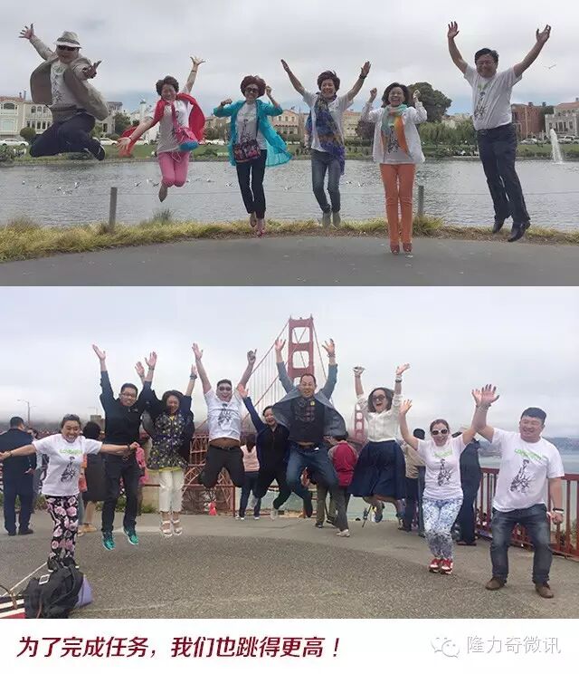 这次旅游行程中,会务组给每一位精英们下达了一系列游戏任务,其中有一条就是和金门大桥来个亲密合影,并且脚不离地,于是隆力奇人各种优美、奔放的POSE跳跃在金门大桥前,没完成一个任务并盖戳认证,待集齐所有印章后就会获得神秘大奖。