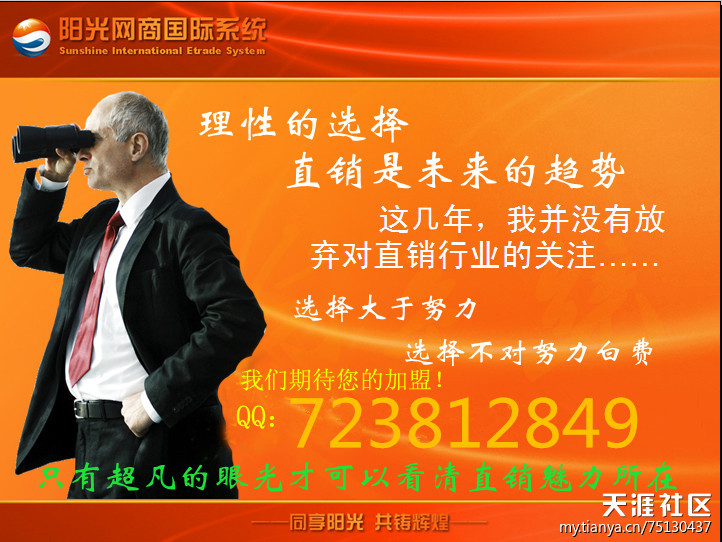 朋友们,直销,给那些没有很多资金、没有很高学历的人们,敞开了唯一的一个致富之门,这就看你是否敢于尝试。如果你经过努力,即使没有成功,你失去的只是少量的资金;但是如果你获得成功,你就是新的百万富翁。