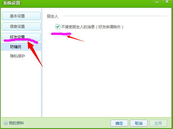 5.继续回到这个页面,点击系统设置 进去之后点击好友设置,在那个(不接受陌生人的消息)前面打上对号