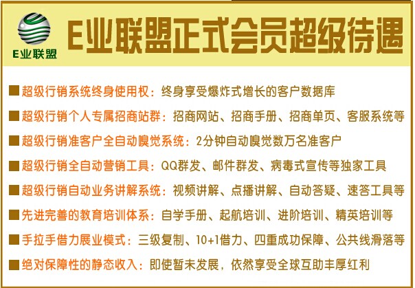 您好,我是E业联盟的专职顾问,我们非常欢迎您考察E业联盟超级行销系统.今后您有任何疑问,可以直接联系我,我会第一时间为您解决! E业联盟是中国网商排名第一的系统创建的一个非常先进的网络营销平台,它能够让我们用最少的代价获得最大的财富收益因为E业联盟是目前互联网最先进的自动进人平台,他会24小时不间断的、自动的给你带来大量的客户,你的客户越多,那么就意味着你的收入就越多。所以这种全自动的进人系统是目前互联网上最先进的模式,也是最简单、最傻瓜式的创业项目关于我们这个事业的具体介绍,请你参加我们每天在yy举办的事业说明会,希望你一定参加。如果您确定能够参加的话,我马上向系统申请名额。在线客服洋洋老师QQ838928581或者QQ1066141354,咨询电话15250119784