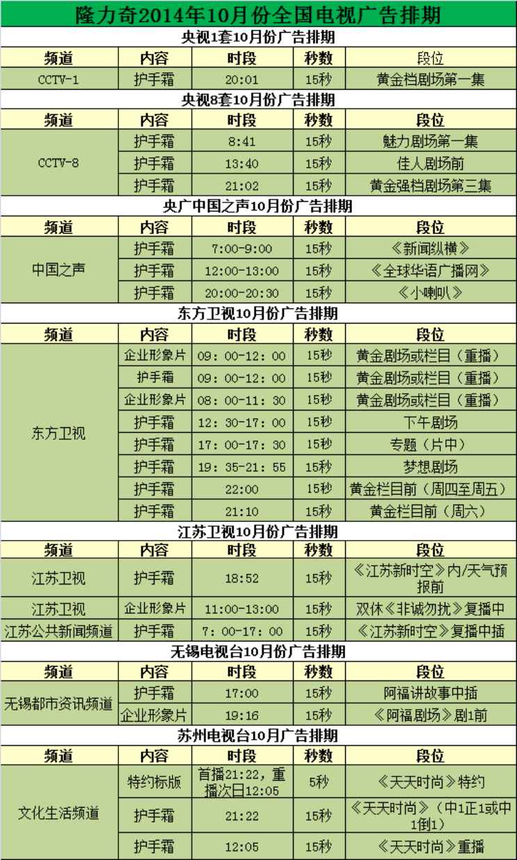 隆力奇护手霜广告、企业形象片将在CCTV-1黄金档剧场,CCTV-8《魅力剧场》/《佳人剧场》/《黄金强档剧场》,央广中国之声,东方卫视《黄金剧场》/《梦想剧场》/《黄金栏目》,江苏卫视、无锡电视台、苏州电视台、常熟电视台中均有播出。