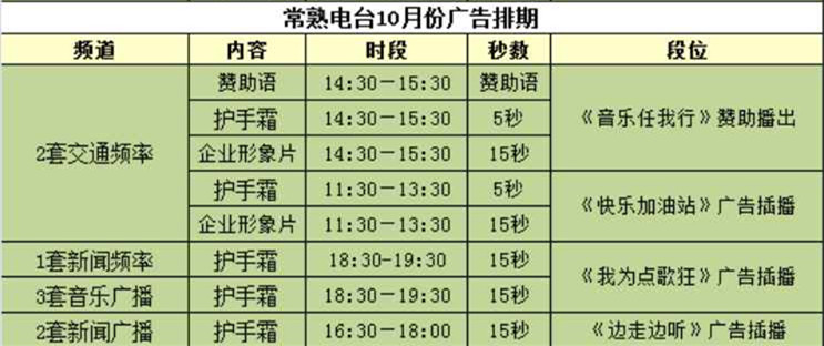 10月,隆力奇护手霜广告、企业宣传片继续驻足常熟电台,当您驰骋在常熟的大道上,打开收音机,切换至2套交通频率、1套新闻频率、3套音乐广播、2套新闻广播,就能收听到小隆对您最真切的问候。