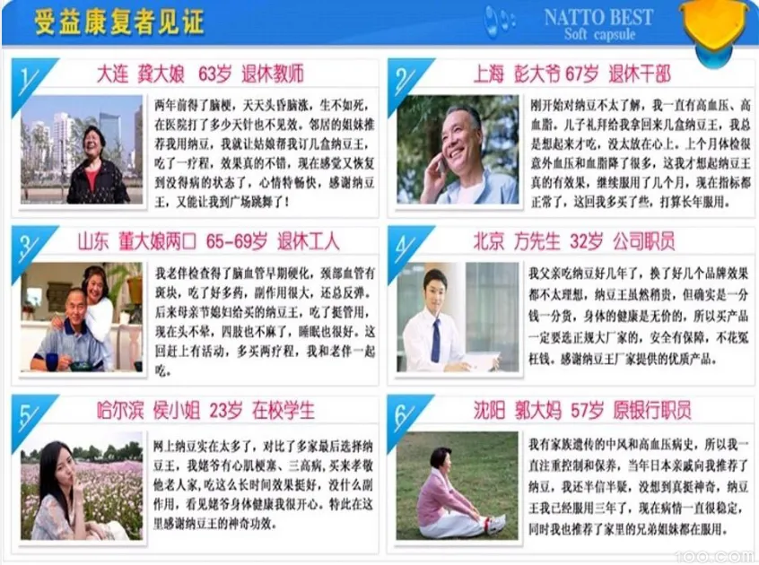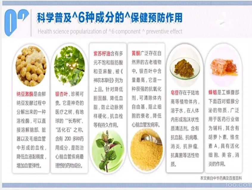 “血管清道夫”之王---心脑血管疾病患者的福音:纳豆紫苏籽油软胶囊,100%原生态纯天然植物精华萃取,高活性、高科技、高品质,世界领先的黄金配方——纳豆激酶+银杏叶+紫苏油,三效合一,一步到位,国家药监局正式批准蓝帽产品。60倍溶解血栓、有效降低血压、清除多余血脂、消除动脉硬化!【产品名称】樱川牌纳豆银杏叶紫苏籽油软胶囊。【产品说明】本品是以纳豆冻干粉、银杏叶提取物、紫苏籽油、蜂蜡、明胶、甘油、纯净水为主要原料制成的保健食品,经动物和人体试验证明,具有辅助降血脂的保健功能。100%原生态纯天然植物精华萃取,高活性、高科技、高品质,世界领先的黄金配方——纳豆激酶+银杏叶+紫苏油,三效合一,一步到位,国家药监局正式批准蓝帽产品。60倍溶解血栓、有效降低血压、清除多余血脂、消除动脉硬化!【保健功效】辅助降血脂。改善心脏血流、保护缺血心肌的功能,降低胆固醇、甘油三酯,升高高密度脂蛋白,改善血液流变学的某些指标,明显改善冠心病患者的临床症状,如对头晕、胸闷、心悸、气短和乏力均有较好的改善作用。【功效成分】每100g含:总黄酮0.54g、总皂苷110mg 。【主要原料】纳豆冻干粉、银杏叶提取物、紫苏籽油、蜂蜡、明胶、甘油、纯化水。【适宜人群】血脂偏高者。【不适宜人群】少年儿童、孕妇、乳母。【批准文号】国食健字G20140251。【食用方法及食用量】每日2次,每次3粒,口服。【规格】0.5g/粒*90粒/瓶*6瓶/盒。【保质期】24个月。【贮藏方法】密封,置阴凉干燥处。【注意事项】本品不能代替药物。【主要作用】 1、溶解血栓、调节血脂、血压及预防粥状动脉硬化。 2、调节血糖、调节肠胃润肠通便排毒养颜。 3、抗菌、抗氧化、抗癌作用、防止骨疏松。 4、解酒、保护肝脏、缓型减肥不反弹。 5、明显改善女性更年期综合症。 6、预防飞蚊症。 7、纳豆中富含纳豆菌和优质缮食纤维,可以抑制肠内病原菌生长,清理肠道,防止便秘,改善消化系统;还具有除皱、抑制雀斑的美容功效。 8、纳豆中起码有5种抗癌物质,特别是异黄酮,它能有效预防、治疗乳腺癌。 9、纳豆中富含的优质蛋白和卵磷脂极易被人体吸收,有效补充人体所需营养。 10、纳豆含有人体所必需的22种微量元素、18种氨基酸、10种矿物质,对预防醉酒及小儿挑食厌食,对高血压、高血糖等多种病症都用一定的食疗保健作用。【特点】60倍溶解血栓、有效降低血压、清除多余血脂、消除动脉硬化: 1、快速溶解血栓,疏通血管——避免心梗、脑中风等。 2、清楚血管壁沉淀杂质,洁净血液——修复受损血管。 3、有效降低血压,改善血液微循环——预防动脉栓塞猝发。 4、降低血液粘度,降低胆固醇——预防动脉粥样硬化。适宜人群适用于心脑血管障碍及高血脂,高粘血症,高血压,动脉硬化,冠心病,脑血栓,心脑供血不足,中风后遗症等人群服用。 1、血栓隐患及血栓性疾病人群; 2、心脑血管疾病(高血脂、高血压、高血粘、高血糖、冠心病、动脉硬化、中风后遗症)人群; 3、免疫力低下者; 4、肠胃功能失调人群,经常便秘者; 5、中老年骨质疏松人群、肿瘤人群; 6.、经常应酬者; 7、所有成人,尤其 35岁以上者; 8、有家族遗传史(如高血压、糖尿病、冠心病等)有不良生活行为者,如吸烟酗酒、缺乏运动; 9、有代谢综合征倾向,如肥胖、高血压、高血脂、高血糖、高血粘引发的动脉硬化、心脏病、冠心病、心肌梗死、脑血栓及后遗症患者。尤其是以下人群更应当引起高度重视,需要立刻预防心脑血管疾病。(1)机关干部、企事业领导、知识分子等。由于他们每天压力过大,精神紧张,导致人体神经失调,新陈代谢发生紊乱;主要器官功能失去平衡,易造成动脉硬化,从而引起冠心病和脑血栓。(2)烟酒过度、生活无规律者。他们较易造成血管痉挛,血流不畅,往往过早患心脑血管疾病。(3)肥胖及饮食不科学者。他们往往营养过剩,使血液中的胆固醇含量过高。(4)40岁以上者,尤其是有头晕目眩、心慌气短、记忆力衰退、四肢麻木、听力和视力下降等症状的中老年朋友。注意事项孕妇不推荐食用,手术前后2周暂停食用,以免影响伤口愈合。其它与血液凝集相关疾病,须先请教医生后方可食用。若有大量出血,如血管破裂、意外事故等也应避免食用。如脑溢血患者须在症状发作期后3个月才适合食用。纳豆激酶胶囊属于功能性食品不能替代药物。不受胃酸干扰,直达小肠吸收,体内作用时间8-12小时。低热量,低蛋白,肥胖及肾病患者可安心食用。与药物同食无抵触且可降低药物的不良反应。不含嘌呤与维生素K2,痛风及服用华法令患者也可安心食用。服用后的效果,立竿见影:第一阶段:服用7天,血液活起来:胸闷心慌、头晕眼花、失眠、手脚发麻僵硬等症状逐渐消失,血压、血脂开始降低。第二阶段:服用1个月,血栓逐渐溶解,血液循环通畅,避免了二次中风的危险;血压、血脂接近正常值、并且稳定;重病患者麻木的肢体,开始稍有知觉。第三阶段:服用3个月,血流动起来:血管更加富有弹性,管腔逐渐增大,血液供应更加充分;脑部神经得到了有效滋润,侧枝循环更加密集发达;重病患者语言功能开始恢复,原来口齿不清的人,说话能成句了,眼睛有神,感觉肢体有力。第四阶段:坚持服用,血管通起来:全身的血液得到了一次彻底的清洗,血栓、多余的血脂、粥样斑块都被分