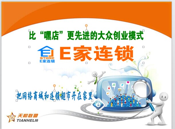 E家连锁,给我们一个改变自己和家庭命运的机会。一个阳光合法的先机理想事业,只要一根网线一台电脑就可以轻松做遍全国生意,做遍全球生意,低风险低成本,消费创富,时间自由,空间自由,兼职全职都可以。只要你有业余时间可以上电脑,会基本操做,这里就是你展现精彩人生的大舞台。