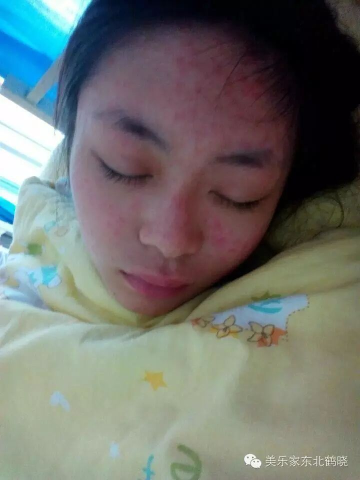 我是一名大二的学生,之前由于军训的原因突发了急性牛皮癣,最开始只是脖子上有一块,以为是过敏就没在意,可短短三周时间,就几乎遍布全身,后背尤为严重,持续高烧,奇痒难忍。当时急坏了家里人,都知道皮肤病异常顽固且不易治愈。后来四奶(鹤晓老师)得到了消息,把我接到自己家里,看到我时就心疼的说这还哪是孩子了,当时身上胳膊腿上脸上头上就没有干净地方,出门必须要长衣长裤口罩帽子遮严实。