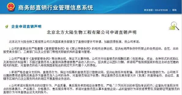 - 【原创】 公布北方大陆生物申请直销声明商务部