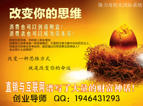 新宇老师:西安人,曾在国企工作,下岗后打过工 创业过,但都未实自己的人生梦想,因为有一颗不服输心,所以一直在寻找创业项目,在13年一次偶然上网时,接触到隆力奇E化直销,被这种住家创业的模式深深吸引,毅然选择了加盟隆力奇E化直销,立志在隆力奇这个平台上带领更多的伙伴走向成功 !她的人生格言是,只有创造,才是真正的享受,只有拚搏,才是充实的生活。★★直销创业导师 ★★商务QQ:1946431293 ★ ★新宇老师 现任中国第一品牌网商创业资深导师,电子商务E化直销经理、创业资深教练, 直销团队金牌讲师,,有着丰富的网络运作经验,网上实战高手.擅长于直销团队建立、人才培养与系统打造,隆力奇团队领导人之一。她将帮您解读财富密码。新宇老师商务:QQ 1946431293朋友,我真心的推荐一个适合我们兼职创业的事业-那就是电子商务,网络直销e化直销!2008年8月25日,网络直销公司在政府的支持下,经过严格的审查,正式获得由国家商务部颁发的直销经营许可证,成为我国第24家拿到合法的直销牌照的公司。并在2010年4月21日正式启动全球市场计划。 2010年底,网络直销公司“E化”直销,将直销推向互联网启动“电子商务”,全面推出电子商运营模式。并聘请了专业的管理服务团队具体负责具体业务,从而为我们提供了一个崭新的平台 ,直销以后靠的是团队的帮助 和教导还有老师的精心培育,帮助你走入辉煌 !互联网与直销不仅改变了世界 也改变了我们的生活!生在当今这个移动互联网时代,谁都难以独善其身 !未来是互联网与直销的时代,每个人都身在其中,也与每个人息息相关!傻瓜式直销在线咨询中心!!这里是没有围墙的大学,老师手把手的教会您如何从不懂→懂→如何复制→如何倍增→业绩做大→人数增加→数钱数到手抽筋!您只需要把您的业余时间利用起来,就有机会成为百万富翁,反正闲着也是闲着,不如搏一把!走过路过,了解没错,宁可明明白白放弃,也不糊里糊涂错过。解读财富密码,导航成功之路!消费创富理念;★★★★★★直销创业导师 ★★商务QQ:194 64 31293 ★ ★★★★★全球招商网站 http://jslbj.com/1142382398/零投资创业网站:点击免费注册 http://kaixin002.eylm.cn/1