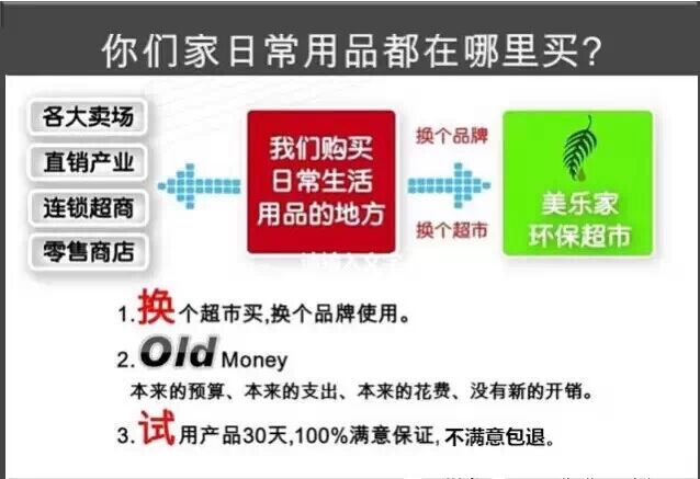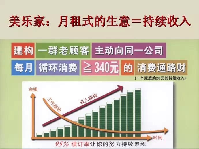 直销主要是不断依赖新增业绩赚钱,进的人多,流失掉的也多,顾客的流失率非常高,因为直销採取的完全是机会导向,不断给人圈地画饼,讲事业机会,讲远大梦想。而美乐家则把大量的心思花在照顾纯消费者身上,因为它知道留住消费者,经营者才留得住,它拥有一套针对消费者心理和需求设计的留住顾客系统,这套系统的目的,就在于帮助我们留住顾客。留不住的顾客也就失去了,我们找他换用超市的意义。经营美乐家的目的不在于不断去开发新市场,而是让老顾客留下来,每月持续重复消费。