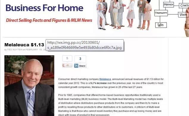 Melaleuca $1.13 Billion Revenue In 2012 美乐家年营业额超过11.3亿美金 by Ted Nuyten on February 18, 2013 作者:Ted Nuyten 很多人对于美乐家在2013年北美年会上宣布其北美年营业额已经超过雅芳、安利等直传销巨头,排名在组织行销的第一名表示怀疑。 对此,想说的是,在一个诚信度远比中国高的美国,这种话可不能乱说的,不然这种欺诈将会付出法律的代价。 ,昨天,获悉了这篇来自北美的直销行业网站的新闻稿,也算是对美乐家这一说法的真实性作了一个佐证。由该文章尚无人将其翻译成中文,天问自不量力,借助谷歌在线翻译,稍作润色,将它翻译给大家了。 (2013年6月1日于厦门) Consumer direct marketing company Melaleuca, announced annual revenues of $1.13-billion for calendar year 2012. This is a 9.2 % increase over the previous year. As one of the country’s most consistent growth companies, Melaleuca has grown in 26 of the last 27 years. 消费者直购公司美乐家,宣布2012年营业额为11.3亿美元。比去年增长了9.2%。作为在美国最知名的持续成长型企业之一,美乐家保持过去27年中的26年美乐家持续增长。 Prior to 1985, companies that offered home-based business opportunities traditionally used a Multi-level marketing (MLM) business model. The Multi-level Marketing model has multiple levels of distribution where distributors purchase products from the company and then try to make a profit by reselling those products to other distributors or to customers. A criticism of Multi-level Marketing is that those who cannot resell inventory they purchase end up losing money and are stuck with boxes of product in their possession.在1985年之前,传统的人员式直销企业,都是以多层次直销(MLM)的方式在提供以家庭为单位的创业机会。直传销以直销商(中间商)的身份向直销公司进货,赚取利润主要靠以多层次的价差方式,倒卖这些产品给其他下线直销商或消费者。而直传销受到的最大批评是:大量直传销商在进货后并不能将产品转售出支造成囤货、赔钱,造成他们被套牢。