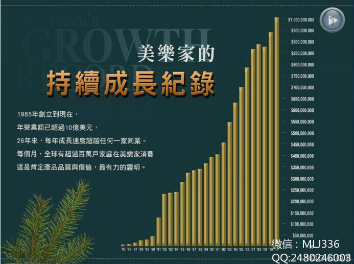 尽管北美的直传销竞争对手面临营业额下滑与勉强维持原来的营业额,但美乐家却持续蓬勃发展。有意思的是,2012年美乐家公司的增长,年营业额大部分来自美国和加拿大本土的成长,小部分营业额则来自其他14个国家。 (很多质疑美乐家在北美排名第一的原因是——安利以其全球近113亿美金的年营业额依然雄据全球直销企业第一名。但各位不要忘了,安利最大的市场早已经不在本土,单年安利(中国)就占了271亿人民币(44亿美金),这还不包括印度、东欧等这样同样是市场潜力巨大、增长超快的市场,而安利在全球有超过80多个国家和地区的分公司! 举例:美乐家在北美超越安利的,相当于这一样个类比——美乐家在上海的营业额超过安利,而在内陆郑州没有超过,在全国市场量多没超过。请问在上海的竞争激烈还是在郑州?不要忘记,美乐家全球仅仅才15家,而且直销市场没有15年以上的区域市场,它不会考虑进入。一个在竞争更激烈,市场更发达的地区呈现正成长的公司,与一个在第三世界正成长却在本土倒退的公司,哪个更强?各位思考!) Melaleuca CEO Frank VanderSloot stated, “Melaleuca’s growth is a tribute to our unique marketing strategy. When we decided to dump the Multi-level Marketing model and switch to Consumer-direct marketing in 1985, we were told the Consumer-direct model would not work and we would go broke trying to make it work. I think our 27-year history of consistent growth proves that theory wrong. The Consumer-direct marketing model has proven to be far superior to Multi-level Marketing.” 美乐家创办人兼首席执行官范德士先生说:“美乐家持续成长是一个验证了我们独特的商业模式的成功。1985年,当我们决定以反直传销方式切换到消费者直购系统时,我们被告知消费者直购是根本是行不通的,而我们做到了。我觉得我们27年持续增长的历史,已经验证了专家们的这一理论是错误的。消费者直购系统已被验证它已经是远远优于直传销模式。”