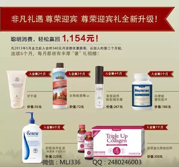 3.新优惠会员入会的第二个月至第7个月,6个月的时间内独享6款尊荣迎宾礼,免费赠送6款排名前十名的明星产品,价值总额1169元,与优惠会员当月订单一起送到府上。聪明消费,轻松赢回1169元