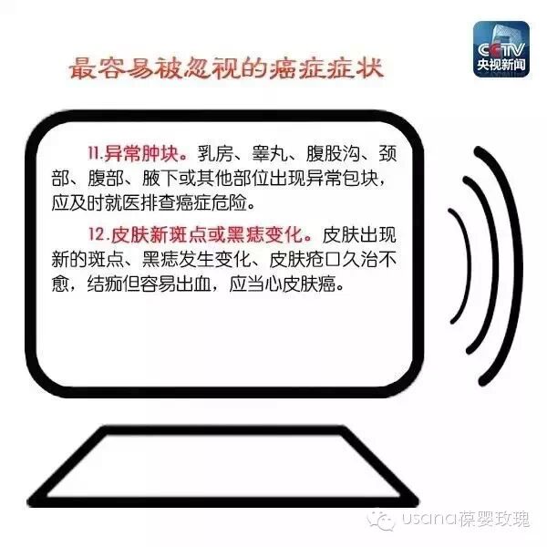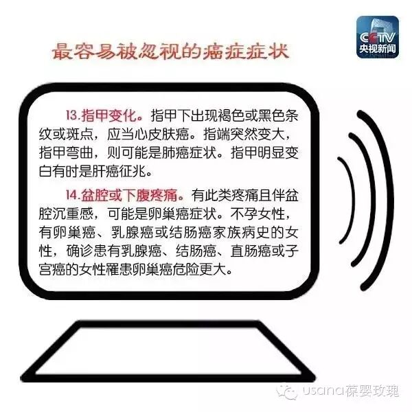 看下图,告诉你16个癌症信号,如果身体出现这些信号,应及时向专业人士求助查明原因。