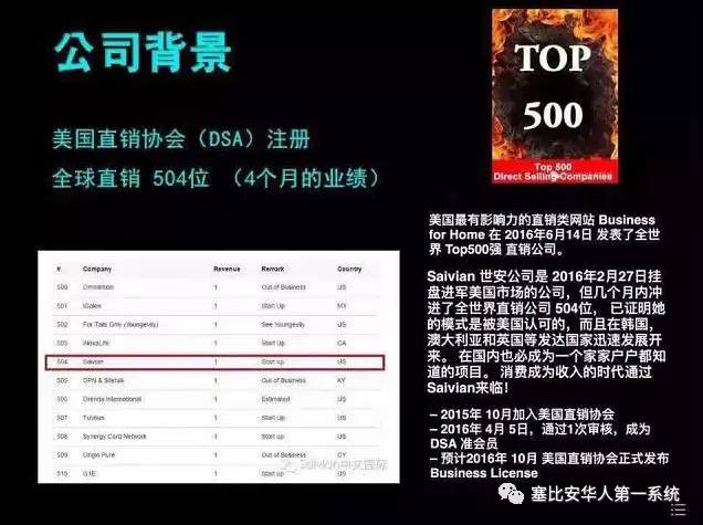 公司虽然不是最最关键的,但也不能完全无视,赛比安公司前身是专业的市场调研机构以及大数据分析公司,这对于运营赛比安这种模式来说这个行业经验是非常有利的,正因为一直做大数据分析,才能更准确的把握消费者的动态,比没有这方面经验的公司做起来成功率至少高出好几倍。事实也证明,赛比安2016年2月开始在美国正式上线运营,目前在美国已经拥有超过50万的会员,四个月时间进入DSN全球排名504位!绝对是未来的一匹大黑马!