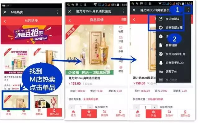 2.分享单品链接:进入“M店热卖”,点击任一单品,进入单品页面,点击右上角分享,发送给朋友,或者 分享到朋友圈