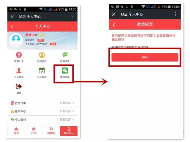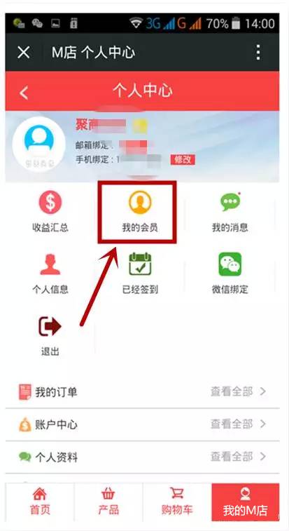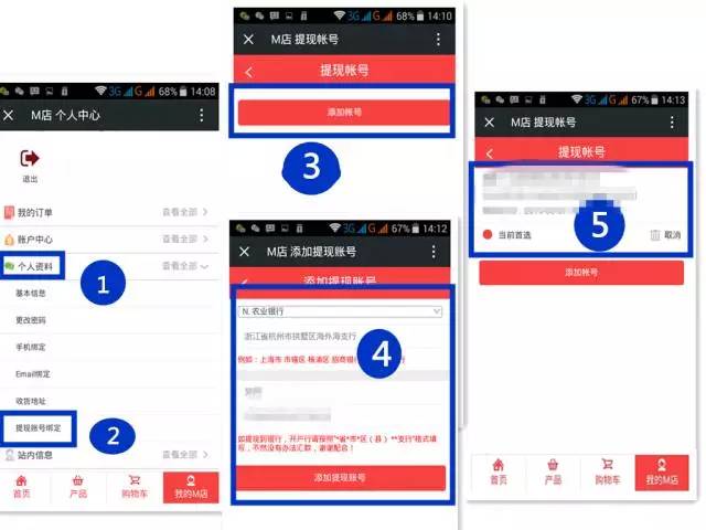 1.提前绑定银行卡:点击我的M店,点击个人资料—提现账户绑定